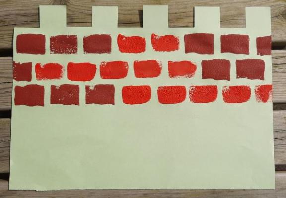 5. Turn your paper over so you can't see the numbers and use the sponge to print rows of bricks. You can use different sized sponges and colours to create different patterns.